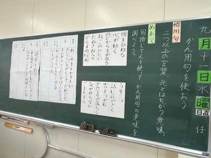 3年国語、「慣用句を使おう」の学習のようすです。この時間は、慣用句の意味を知り、例文を参考にしながら、自分で慣用句を使った文作りに挑戦しました。