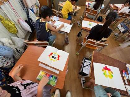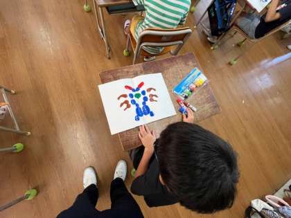 2年の図工「ふしぎな虫」の学習のようすです。画用紙に絵具をはさみこみ、たたんで開いてみると、ふしぎな虫が浮かび上がってきました。