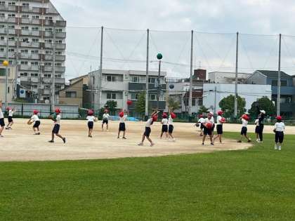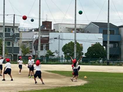 2年体育、「ボールキャッチ」の学習の様子です。高く投げ上げたボールをうまくキャッチできたかな。「キャッチできた!」と大喜びの声が、広い運動場に響き渡りました。