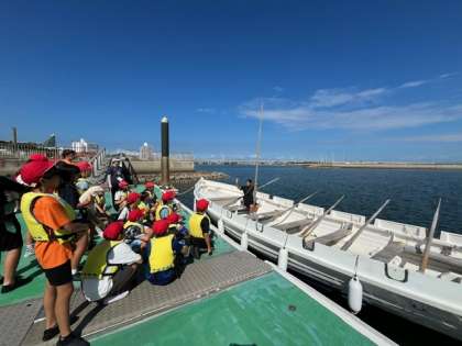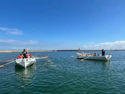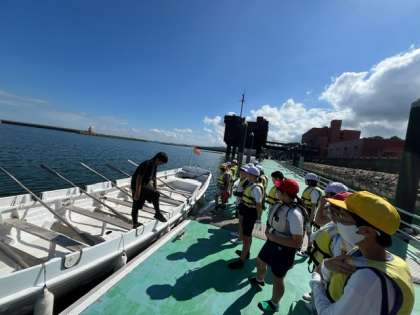 自然体験学習二日目の海のプログラム「カッター」です。1組、2組で、力を合わせて頑張りました。