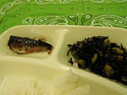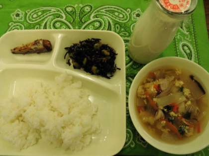 献立は、いわしのしょうが煮、かきたま汁、ひじきのそぼろ煮、ごはん、牛乳でした。