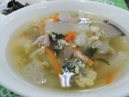 いわしのしょうが煮は、水、しょうが、砂糖、酢、こい口しょうゆ、料理酒を合わせた調味液でいわしを蒸し焼きしています。しょうがと酢がよくきいており、子どもでも食べやすいように味付けされていました。かきたま汁は、しいたけ、こんぶ、かつおぶしからのそれぞれの出汁がきいており、さっぱりしているけれどもこくのある味でした。ひじきのそぼろ煮はひじきの食感のよさがうまく生かされ、枝豆ともうまく調和しとてもおいしくいただきました。見た目は地味な献立でしたが、とても味わい深い献立でした。