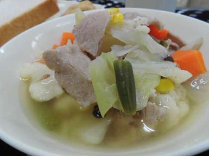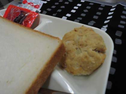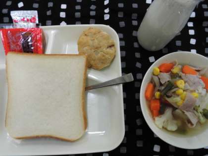 献立は、とうふハンバーグ、スープ煮、固形チーズ、ジャム、パン、牛乳でした。