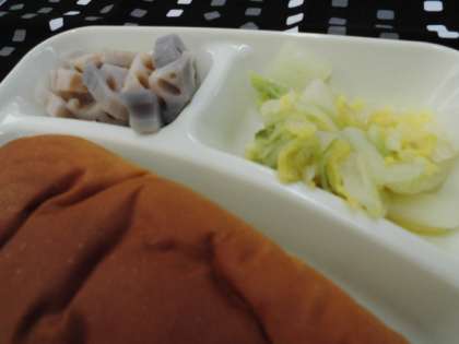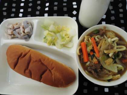 献立は、カレーうどん、はくさいの甘酢あえ、焼きれんこん、パン、牛乳でした。