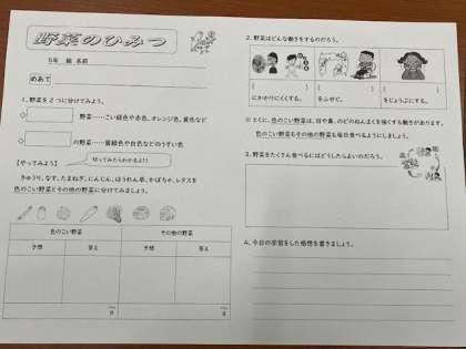 5年の栄養指導の様子です。今日のお題は、「野菜のひみつ」です。野菜のグループ分けや、野菜の働きについて、しっかり学びました。