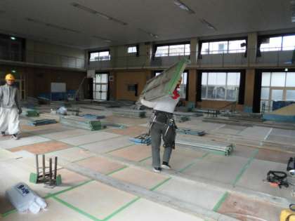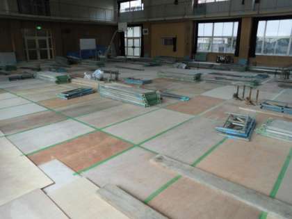 今朝の様子です。昨日で講堂床に板が敷き詰められました。