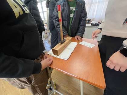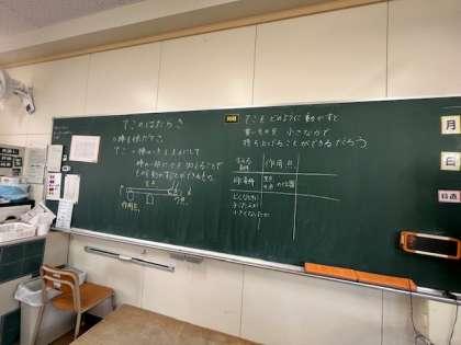 6年の理科、「てこのはたらき」の学習の様子です。棒を使った「てこ」を試してみました。てこをどのように動かすと、重いものを小さな力で持ち上げられるのか?みんな真剣です。