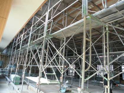 作業やぐらが立ち、やぐらの上に木の天板が渡されていました。