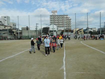 音楽に合わせて初めの1周は、各学年、学級ごとにみんなで走ります。