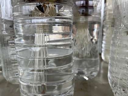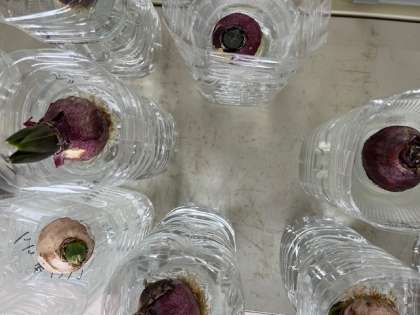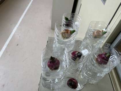 2年生が育てている「ヒヤシンス」です。どんどん根を伸ばし、大きく育っています。