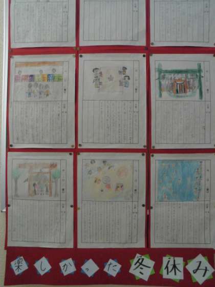 楽しかった冬休みということで、階段踊り場の掲示板に3年生の絵日記が掲示されていました。