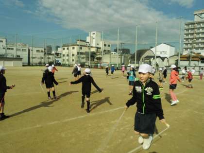準備運動の縄跳びで、早や汗をかいている子どももいます。