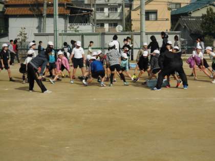 走り終わったら、各学級ごとに声を掛け合って整理運動をします。