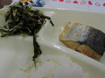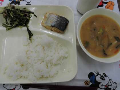 献立は、さごしのしょうゆだれかけ、みそ汁、みずなの煮浸し、ごはん、牛乳でした。