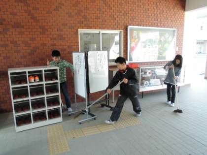 いつも、玄関、正門、ピロティを掃除している4年生の子どもが、今日は特に念入りに靴箱ロッカーを移動させて裏側まで掃き掃除を頑張っていました。