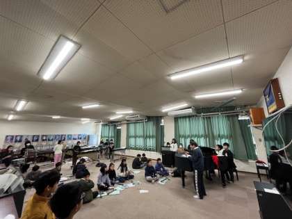 5年音楽の学習の様子です。リズミカルな音が、3階廊下に響き渡っていたので、音楽室をのぞいてみました。子どもたちは、自分のパートを一生懸命練習していました。