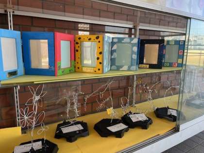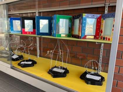 2月の玄関の展示作品です。上段が6年生のフォトフレーム、下段は5年生の針金工作の作品です。
