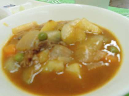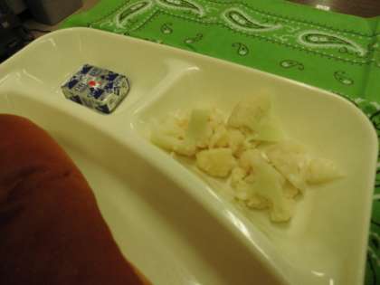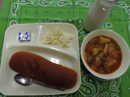 献立は、ビーフシチュー、カリフラワーのサラダ、固形チーズ、パン、牛乳でした。