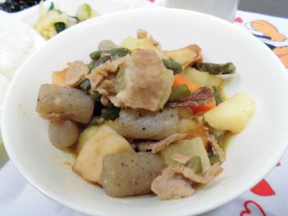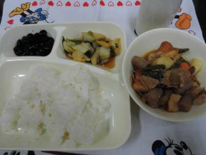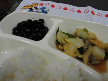 本日のメニューは、 豚肉と赤平天の煮もの、きくなとはくさいのおひたし、黒豆の煮もの、ごはん、牛乳 です。