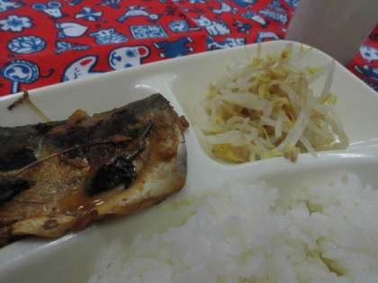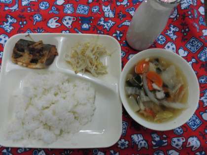 献立は、さばのみそ煮、のっぺい汁、もやしのゆずの香あえ、ごはん、牛乳でした。