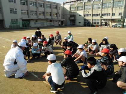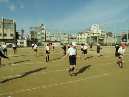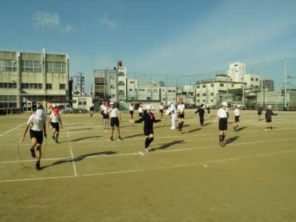 初めは寒くて上着を着ていた子どもが、指導が進むにつれて上着を脱いで縄跳びに集中していきました。