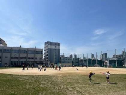 とても広い運動場で、思いっきり走ったり、ボール遊びを楽しむ子どもたちです。私たちの自慢の運動場です。
