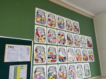 3年図工「カラフルキャンディー」の作品です。教室にきれいに掲示しています。カラフルでおいしそうです。