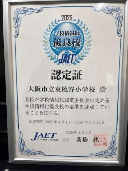 学校情報化優良校認定証が届きました。ますます、ICT機器の活用を進めていきたいと思います。