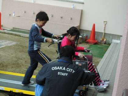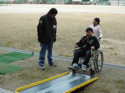 スロープ上り坂の押し方はてこを利用した力を使ってのぼり、階段の段差も教わりました。敷居も前輪はまたぐような扱い方を聞きながら車いすを押していました。