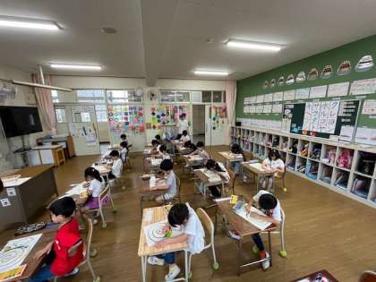 1年図工の学習の様子です。今日は、カタツムリにパスで色をぬりこんでいきました。おとなりのへやにはちがう色をぬりこみました。