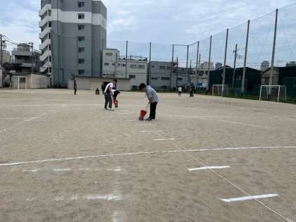 6月12日、今日は、全学年、スポーツテストの「ソフトボール投げ」実施日です。昨日は雨のため、ライン引きは当日の朝になりました。運動場は、昨日の雨で、ちょうどよい湿り具合で、きれいにライン引きができました。