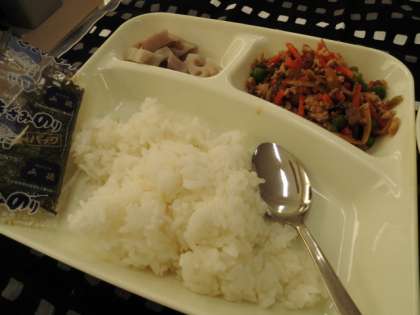 献立は、鶏ごぼうご飯、みそ汁、焼きれんこん、ごはん、焼きのり、牛乳でした。