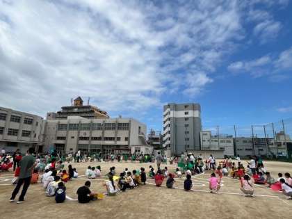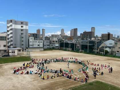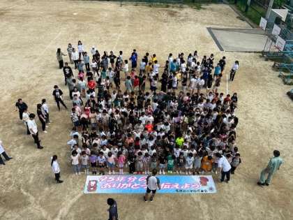 本校は、今年度、創立95周年を迎えました。本日、ドローンによる航空写真の撮影が行われました。梅雨の時期でしたので、お天気が心配でしたが、無事に撮影が行われました。最後に、全校で記念写真の撮影も行われました。