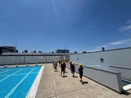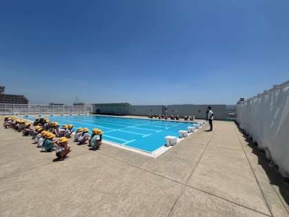 1年生にとって、初めてのプール学習が始まります。今日は、プール開きを前に、プールサイドでプール学習の約束事を確認しました。「早く、プールに入りたい!」という声が聞こえてきました。
