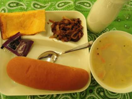 献立は、牛肉のデミグラスソース煮、コーンスープ、かぼちゃのプリン、パン、ジャム、牛乳でした。