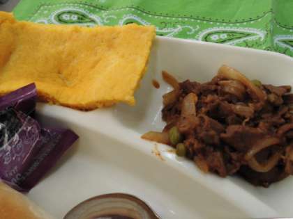 牛肉のデミグラスソース煮は、本格的な調理です。牛肉をワインで下味をつけます。サラダ油を熱し、にんにくを香りよく炒めてから牛肉を炒めます。さらに玉ねぎを炒め、一人あたり3mlの湯を加えて煮ます。煮上がれば、塩、こしょう、りんごピューレ、デミグラスソース、ウスターソース、ケチャップで味付けし、最後にグリーンピースを加えて煮ています。