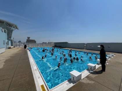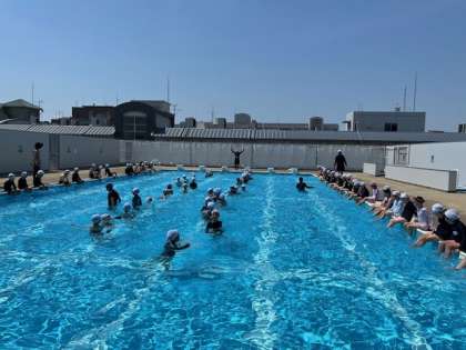 低学年のプール開きが本日行われました。1年生は、初めての大きなプールでの水慣れでした。安全にプール学習ができるように、先生から、大切な話を聞きました。