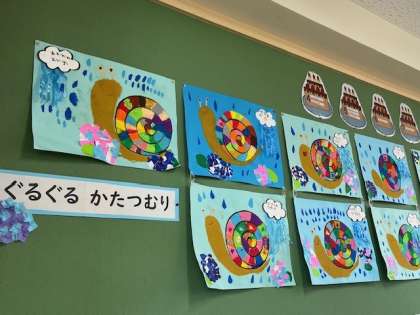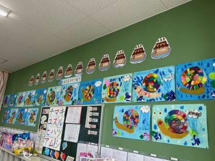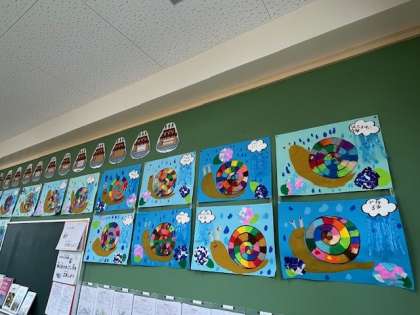 1年の図工作品「ぐるぐるかたつむり」です。カラフルに色ぬりができています。