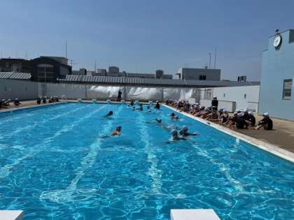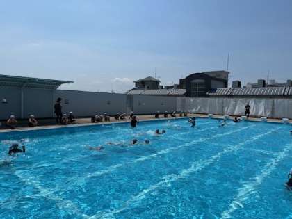 今日は快晴の下、低学年のプールが行われました。水慣れも進み、前回から、プールの横をめいいっぱい使い、ロケットやえび、かに、になりきり、水遊びを楽しみました。