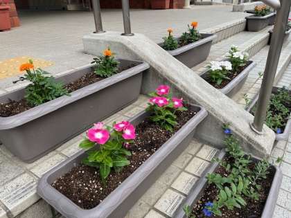 梅雨があっという間に開け、真夏日が続きます。そんな、暑さを、忘れさせてくれる「いやし」です。(ヒマワリ・アメリカンブルー・ニチニチソウ・マリーゴールド・バーベナ)
