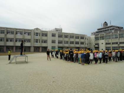寒さがぶり返してきた月曜日の児童朝会ですが、今週も運動場で行いました。