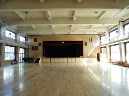 講堂床面の保護材が完全に撤去されています。