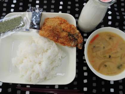 献立は、いわしのフライ、みそ汁、焼きのり、ごはん、牛乳でした。