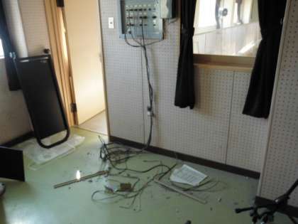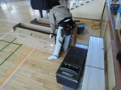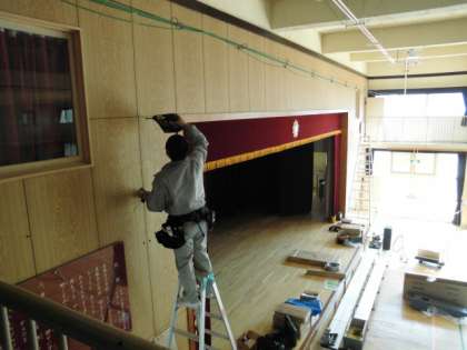 先日、講堂天井の工事が完了したところで、今日はメインスピーカーと放送機器の交換工事が行われています。