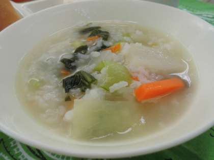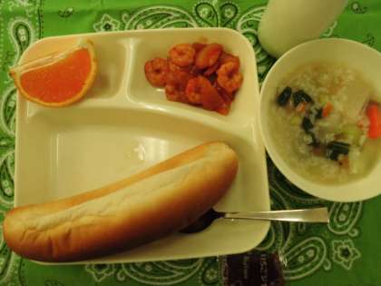 献立は、えびのチリソースいため、中華がゆ、ジャム、パン、牛乳でした。