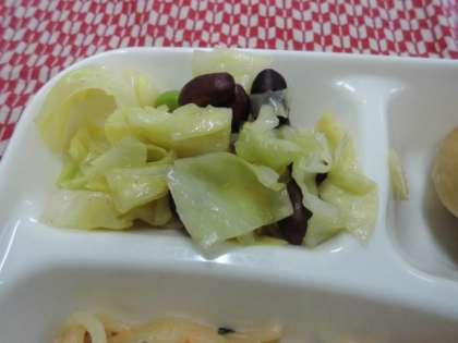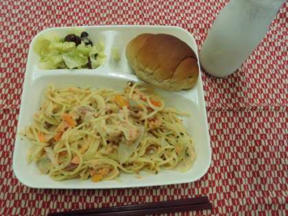 献立は、さけのクリームスパゲッティ、ビーンズサラダ、パン、牛乳でした。