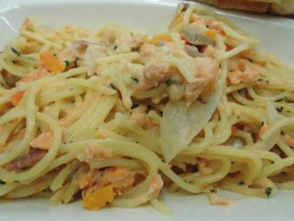 さけのクリームスパゲッティは、学校給食献立表をご覧いただければわかるように本格的な調理方法で調理されています。とてもおいしかったです。