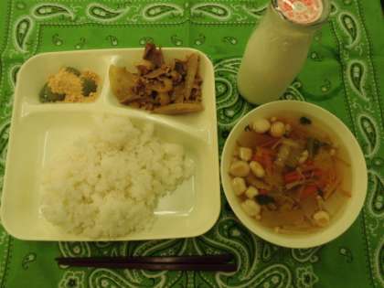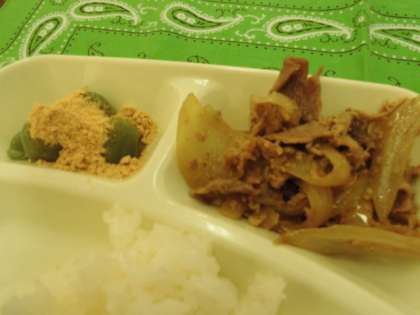 献立は、豚肉のごまいため、すまし汁、きな粉よもぎだんご、ごはん、牛乳でした。