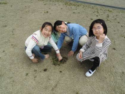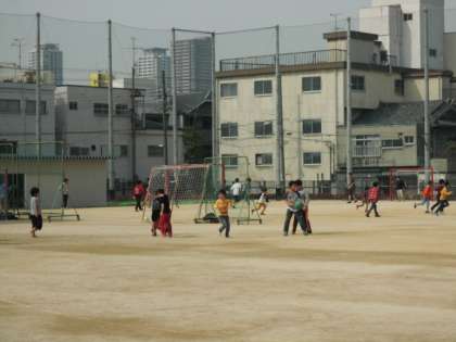 遠くのサッカーコートで、ボールを必死で追いかける子どもたち。