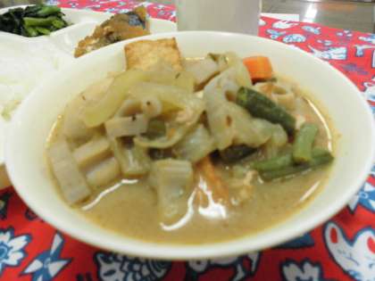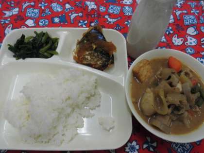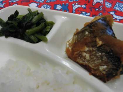 献立は、さばのおろしじょうゆかけ、あつあげとさといものみそ煮、ほうれん草のおひたし、ごはん、牛乳でした。